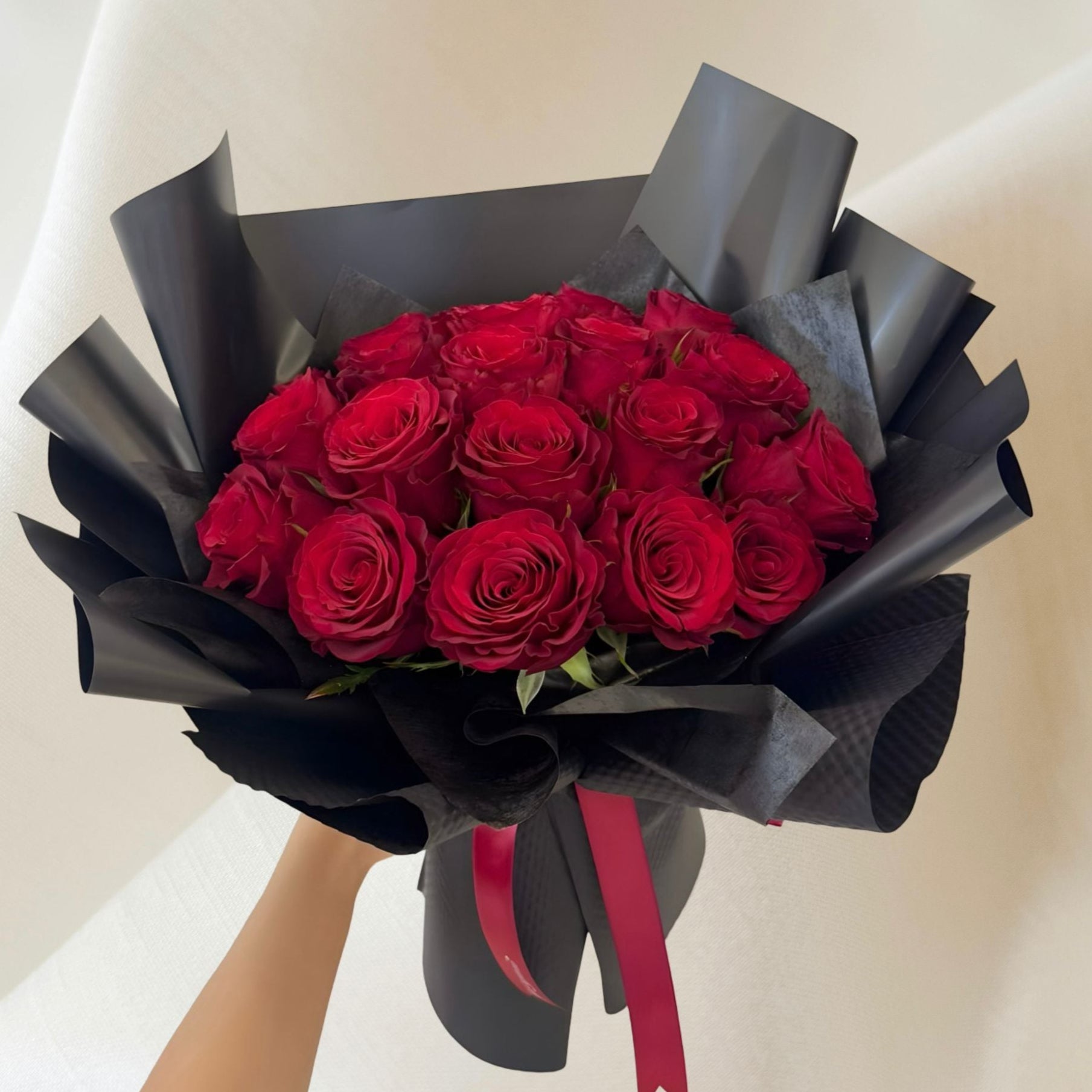 A striking bouquet of 20 premium red roses wrapped in elegant black paper, exuding passion and sophistication. Perfect for romantic occasions, anniversaries, or making a bold statement of love.