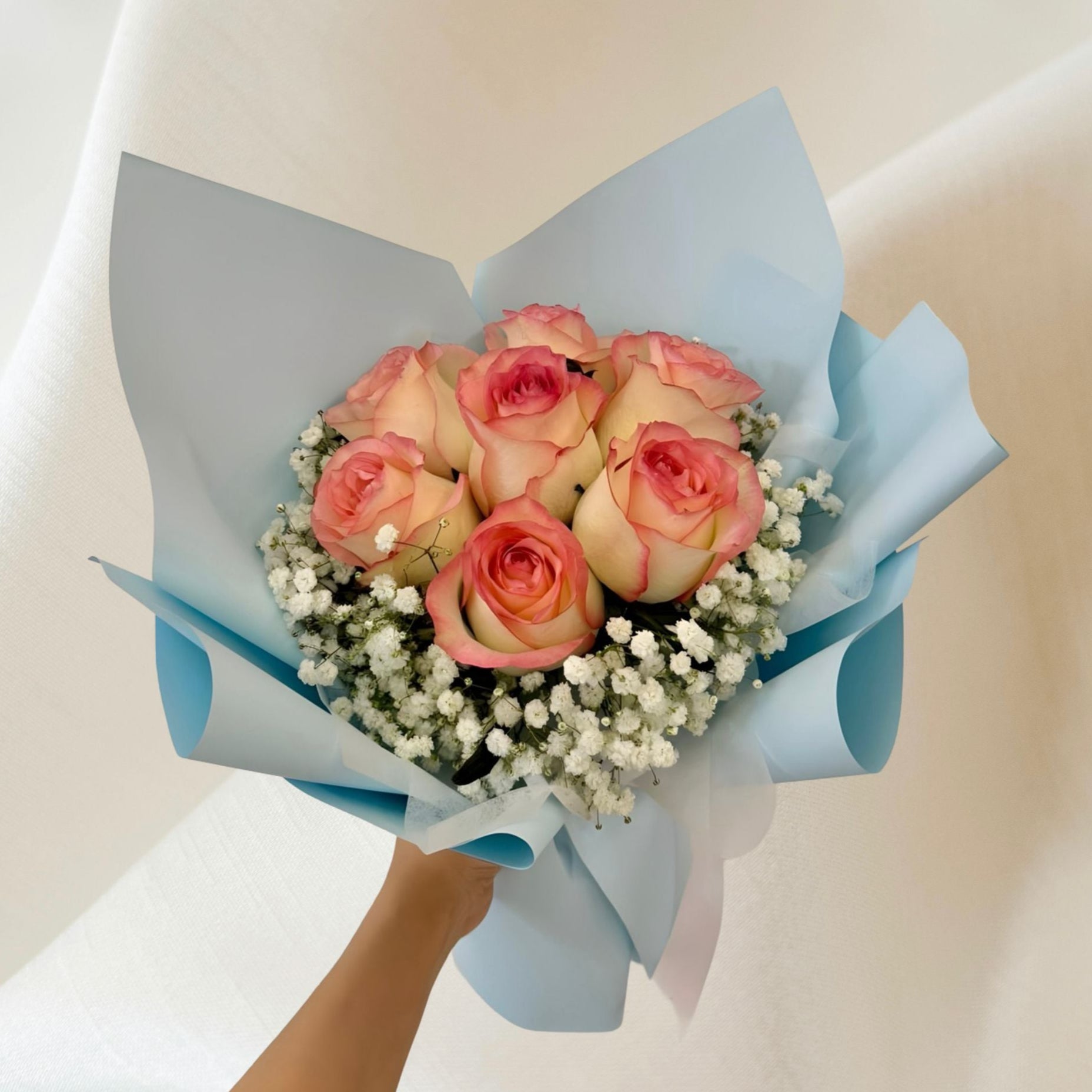 A luxurious arrangement of 7 exquisite center-pink roses, elegantly complemented by delicate baby’s breath and wrapped in sophisticated pastel blue. This bouquet embodies grace, elegance, and timeless charm—perfect for celebrating life’s most precious moments.