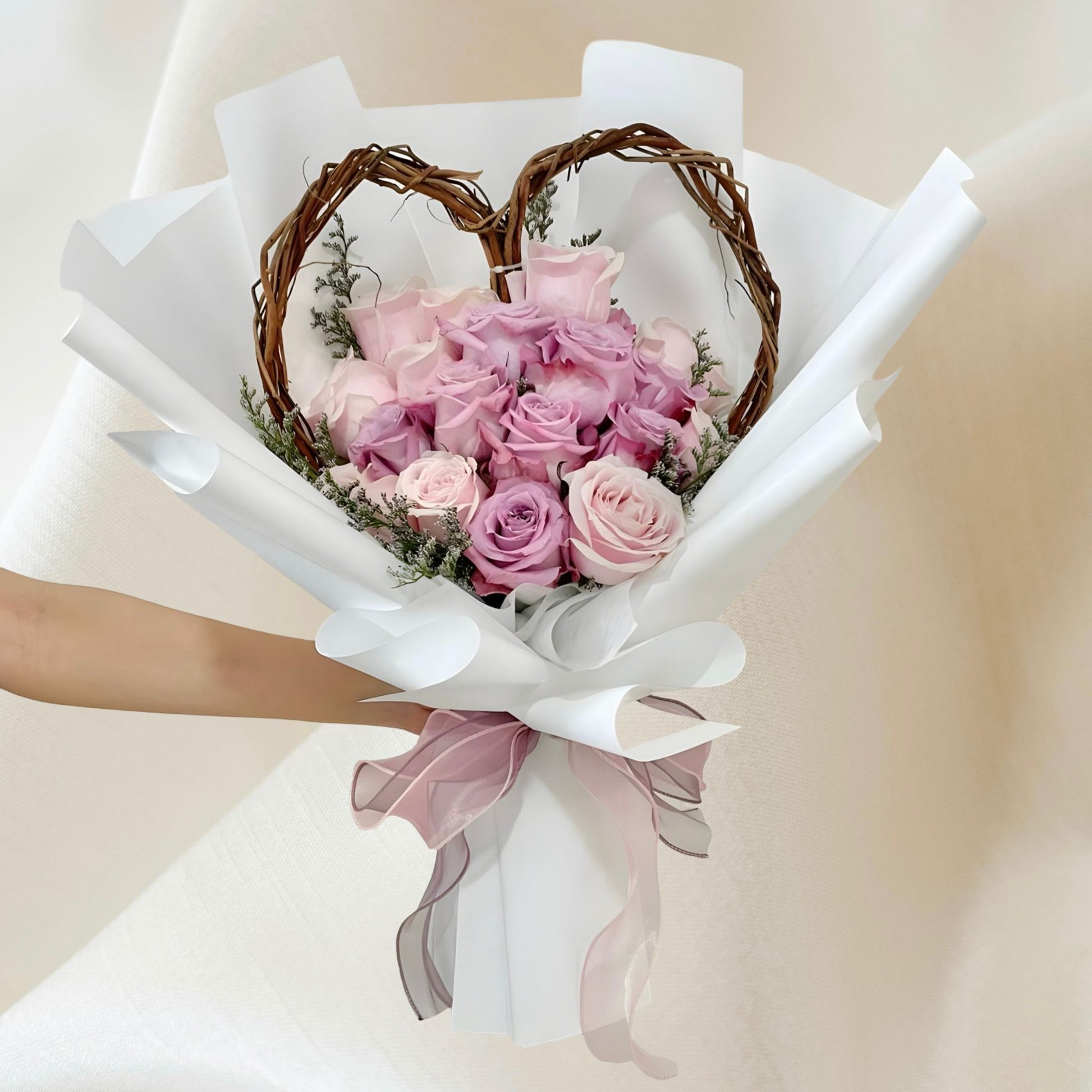 A stunning bouquet that speaks the language of love and elegance, the Ethereal Love Bouquet features a delicate arrangement of soft pink roses, beautifully complemented by sprigs of greenery.Encased within a handcrafted heart-shaped wicker frame, this bouquet symbolizes warmth, romance, and sincerity.