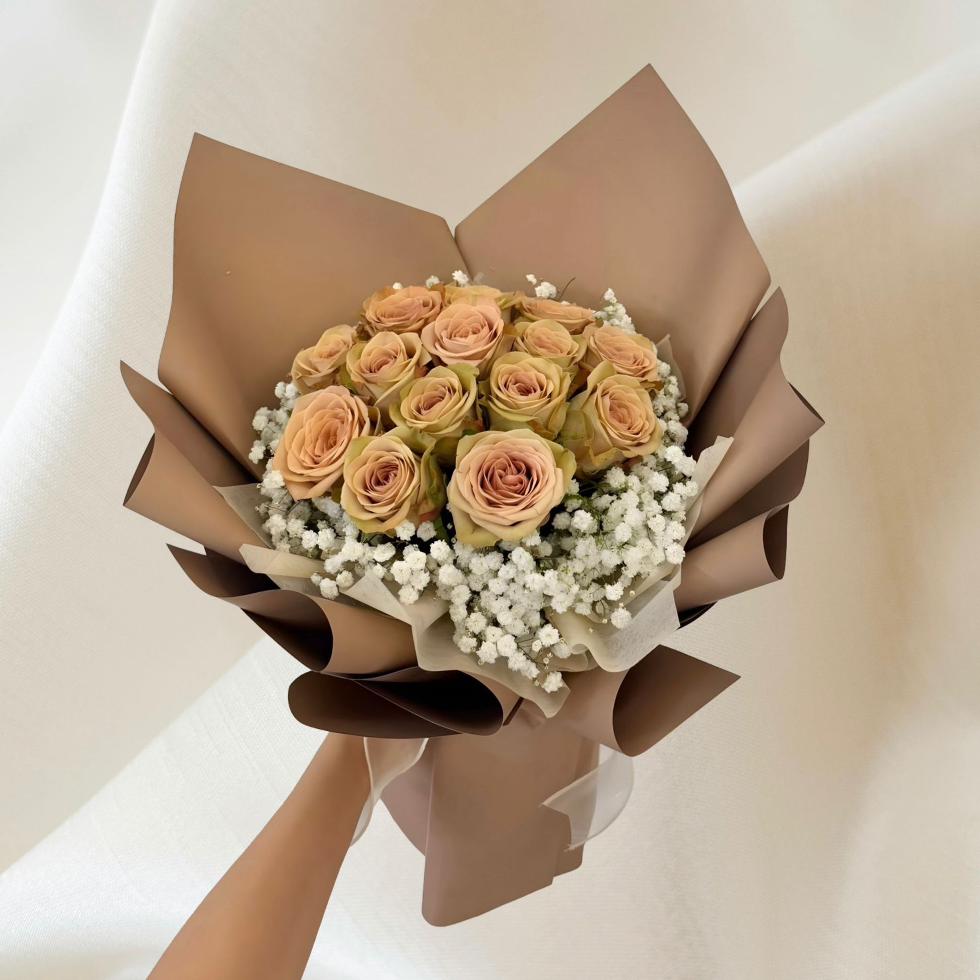 The Cappuccino Elegance Bouquet is a luxurious arrangement featuring 20 stalks of exquisite Cappuccino roses, beautifully complemented by delicate baby’s breath (Gypsophila). Wrapped in elegant earth-toned paper, this bouquet radiates warmth, sophistication, and timeless charm.