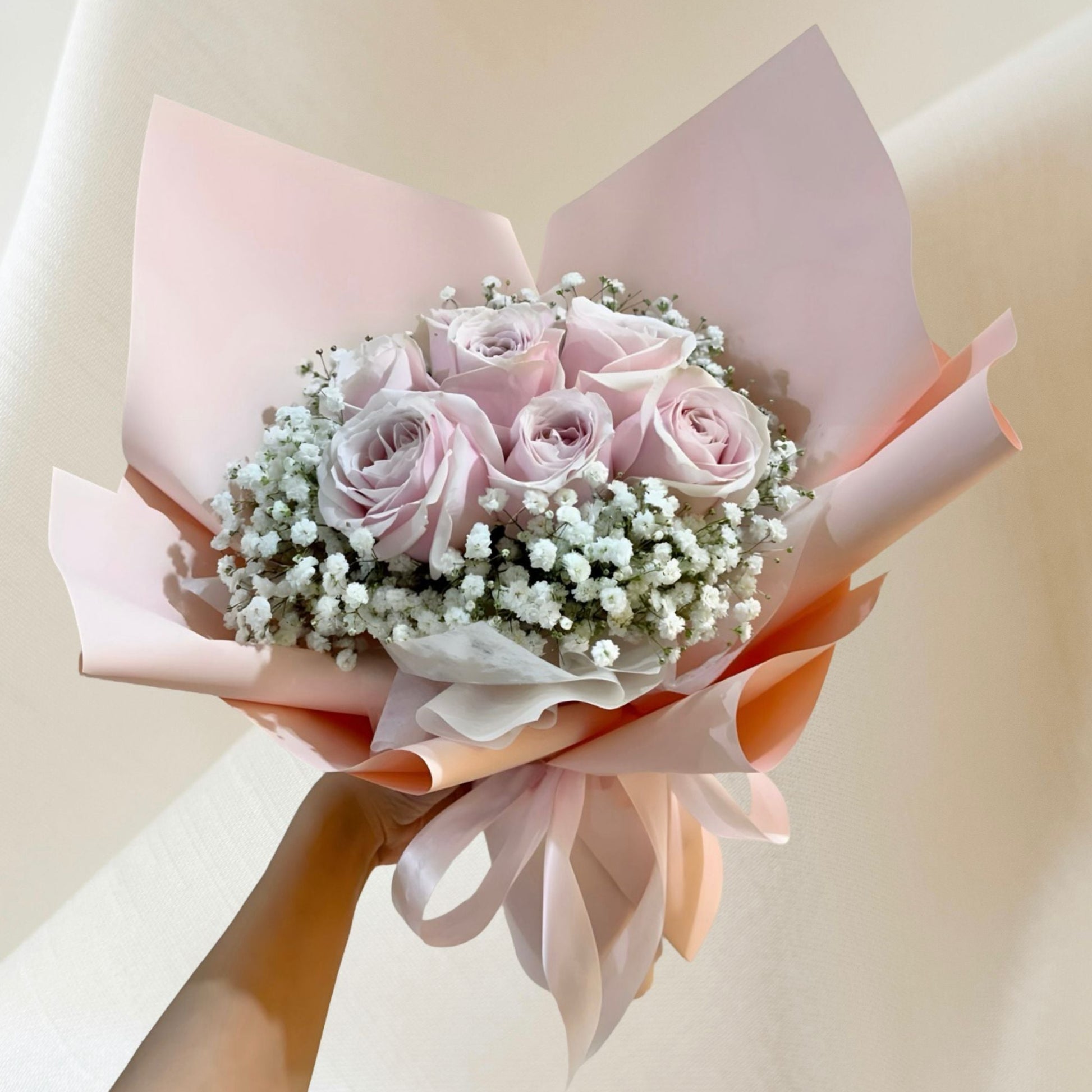 A breathtaking ensemble of 7 snow-pink roses, symbolizing purity and elegance, delicately surrounded by luxurious baby’s breath. Wrapped in soft blush tones with an exquisite satin ribbon, this bouquet radiates sophistication and charm—an impeccable choice for timeless celebrations, heartfelt gestures, and unforgettable moments.